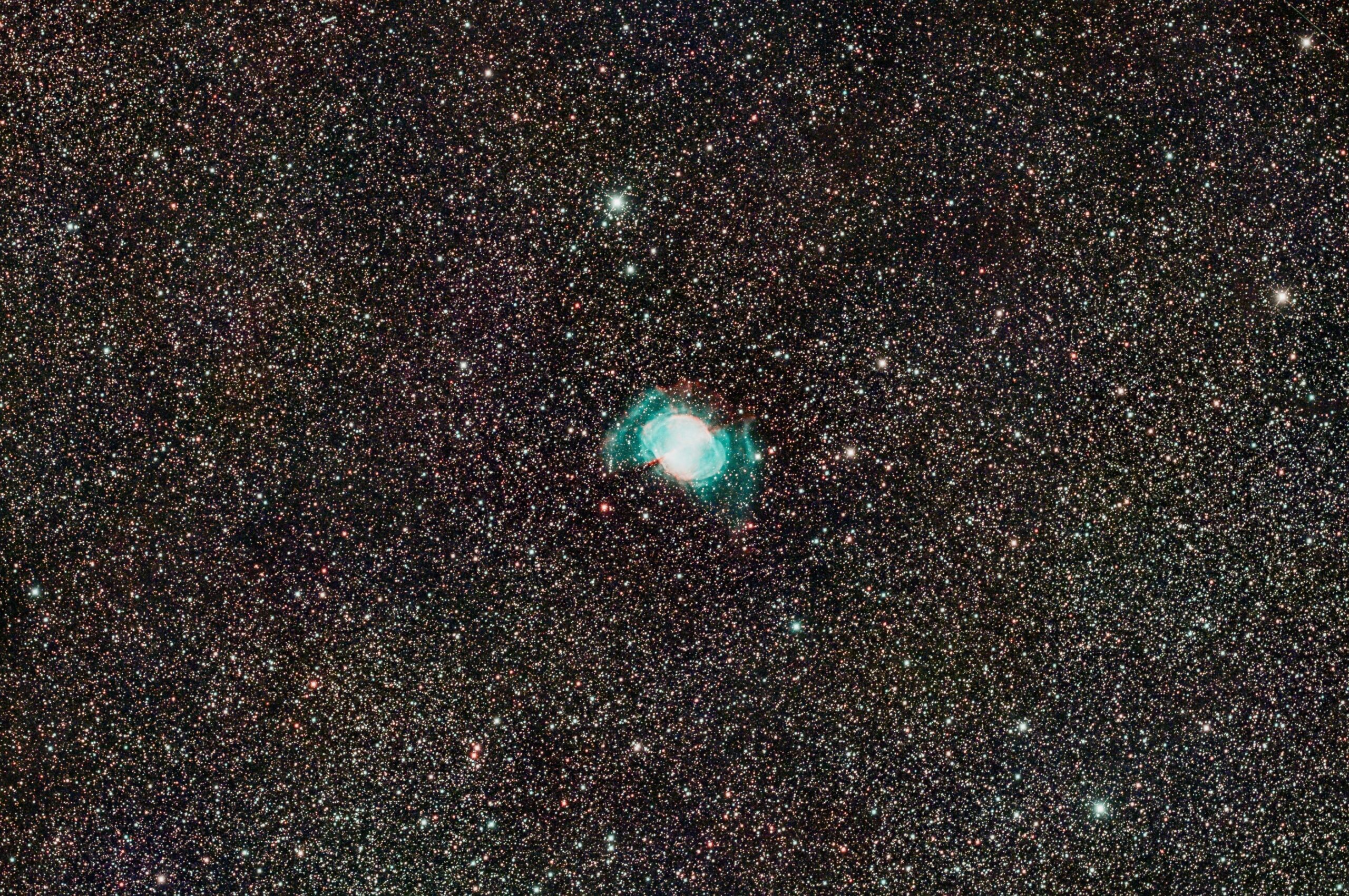 ocated about 1,200 light-years away in the constellation Vulpecula, M27 is a planetary nebula—the glowing remains of a dying star. Its twin-lobed shape resembles a cosmic hourglass, formed as the star shed its outer layers into space. The vibrant hues of ionized hydrogen and oxygen trace the final breath of stellar life, offering a glimpse into the future fate of our own Sun