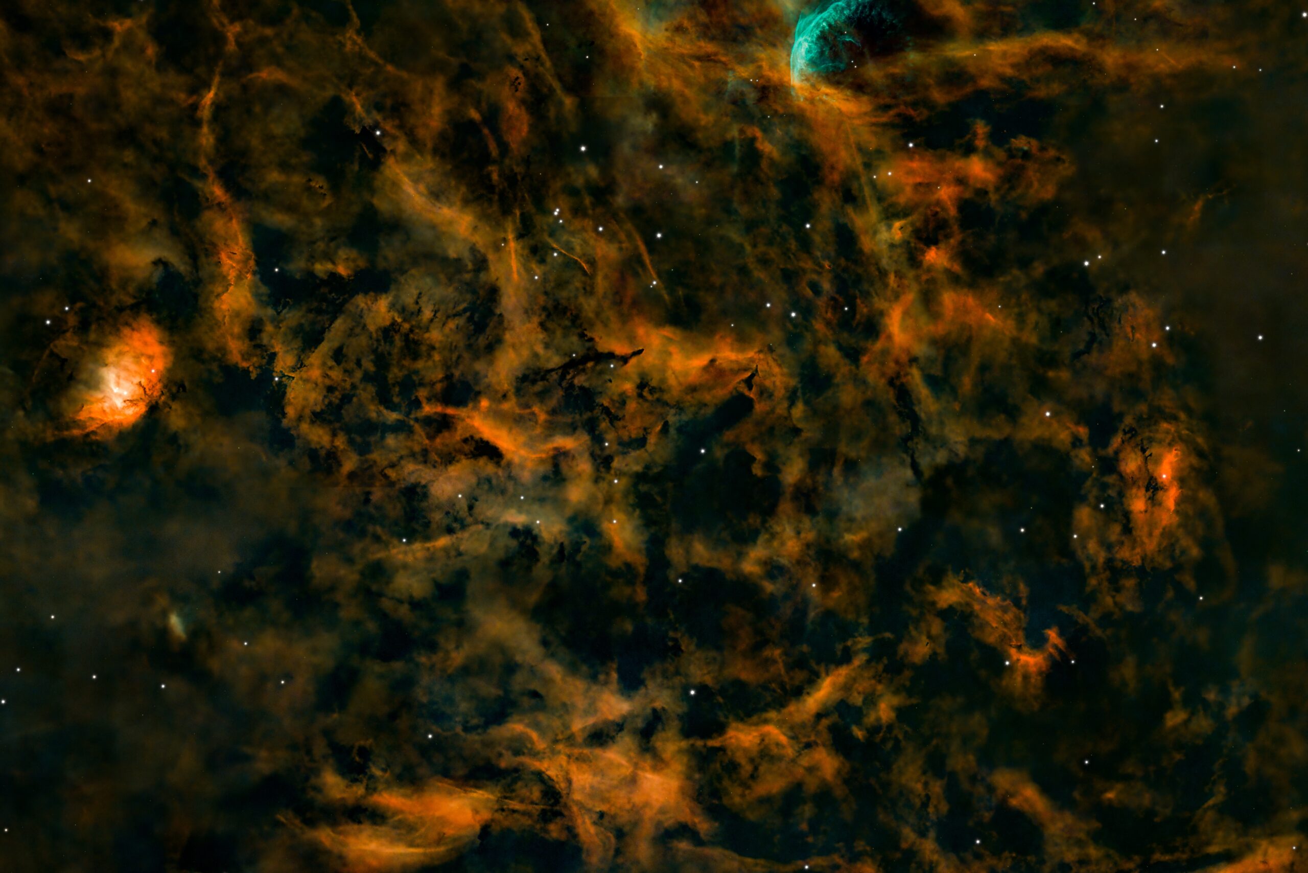 Wolf-Rayet 134 is a very rare and incredibly hot, massive star located about 6,000 light-years away in the constellation Cygnus. These types of stars are in a late stage of their evolution and are known for their powerful stellar winds, which shed their outer layers at tremendous speeds. The faint, blue, arc-like shell around the star is a cosmic bubble—a shockwave formed as the star’s fast wind collides with slower material it ejected earlier. This shell is rich in ionized oxygen, which gives it its characteristic blue-green hue in astrophotos.